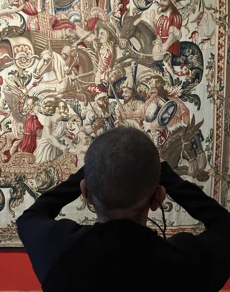 Non, la vraie splendeur c’est cette éblouissante tapisserie ( qui en soi méritait le voyage et aurait mérité une pièce spéciale ) : La charrette des comédiens du tribunal de la mort et Don Quichotte ramené par rire chez lui dans une cage. Manufacture royale de Mortlake 1675. Laine, soie et fils d’argent/ collection privée .